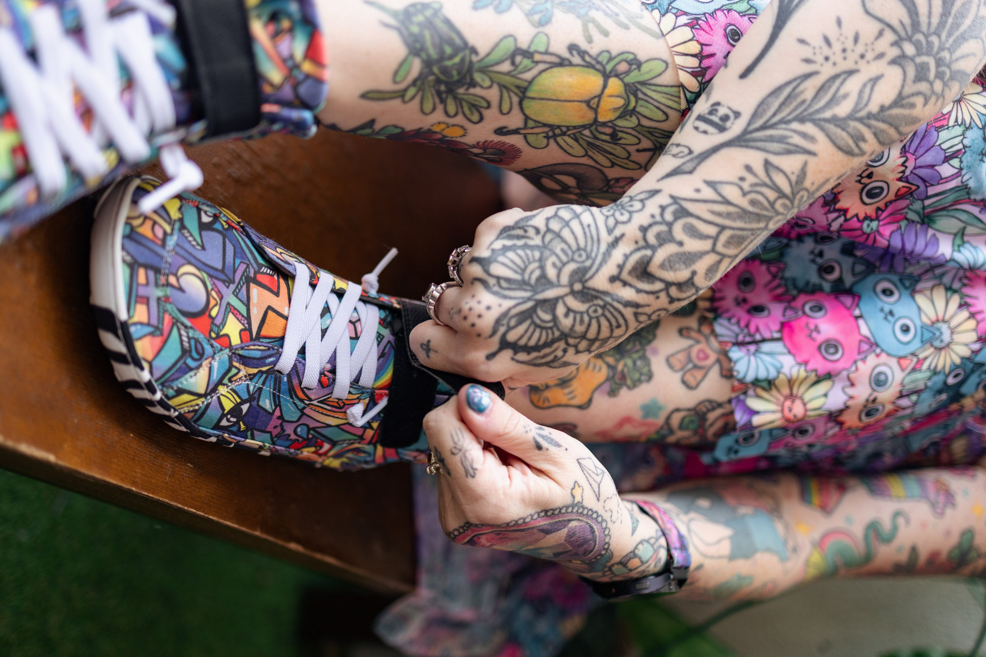 Crafted from printed vegan cotton canvas featuring PaperKrane's own hand-drawn graffiti design in bright, bold 90s colours, these mid-tops have elastic laces and a convenient velcro ankle strap for easy wear, plus a soft microfibre suede lining and our playful zebra sole. The vibrant street art pattern brings energy to every step – perfect for urban explorers, festival-goers, or anyone channeling that classic 90s hip-hop aesthetic.