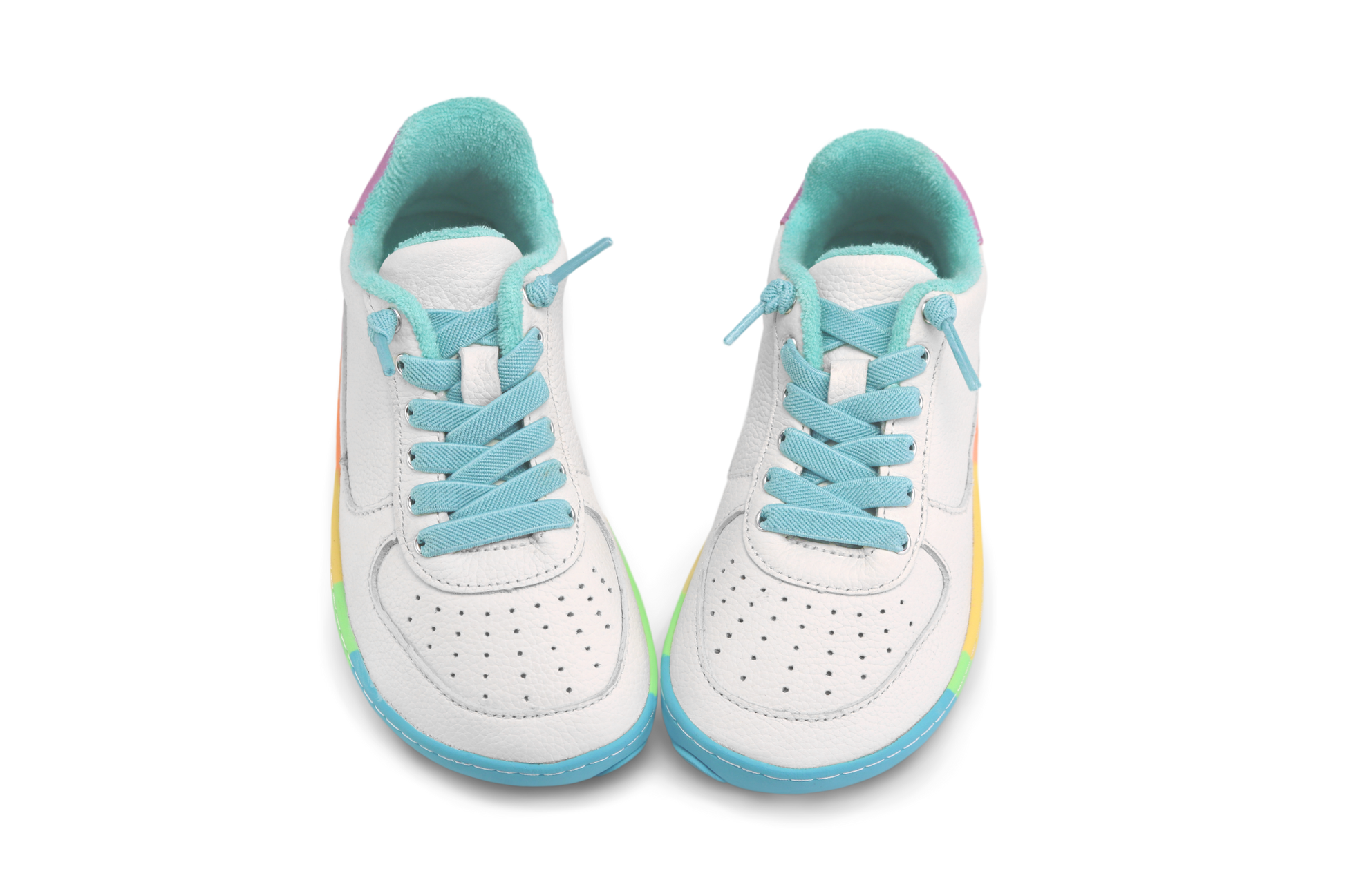 Crafted with our foot-shaped design and flexible construction, they're made from our luxe white leather, with a POP of PURPLE leather in the heel detail, terry cotton lining, bold blue laces (for adults) or elastic laces (for jnr sizes) and our iconic RAINBOW rubber soles, these kicks are idea for those ready to step into vibrant style and comfort.