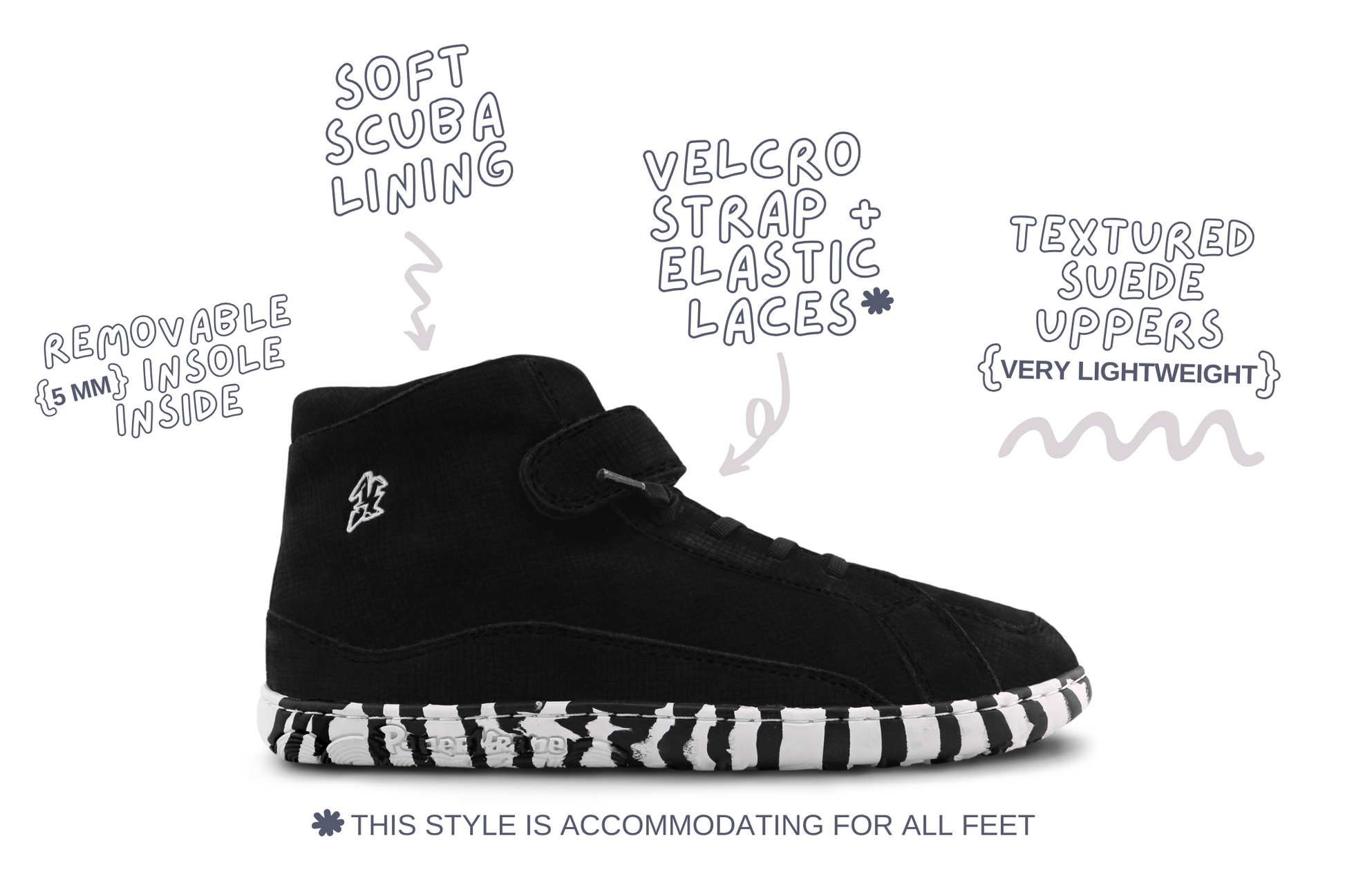 Crafted with our foot-shaped design and flexible construction, they're made from luxurious black textured suede, with a soft scuba knit lining and our attention-grabbing zebra soles that deliver beautifully thin, flexible barefoot comfort. This sophisticated design proves that premium materials and eye-catching details can look absolutely incredible while delivering unmatched barefoot freedom.
